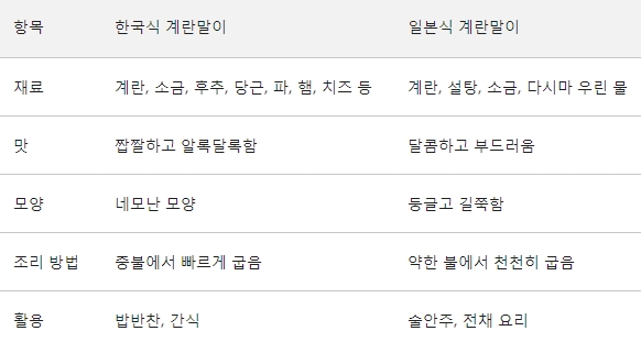 한국식 계란말이와 일본식 계란말이의 차이점 요약
